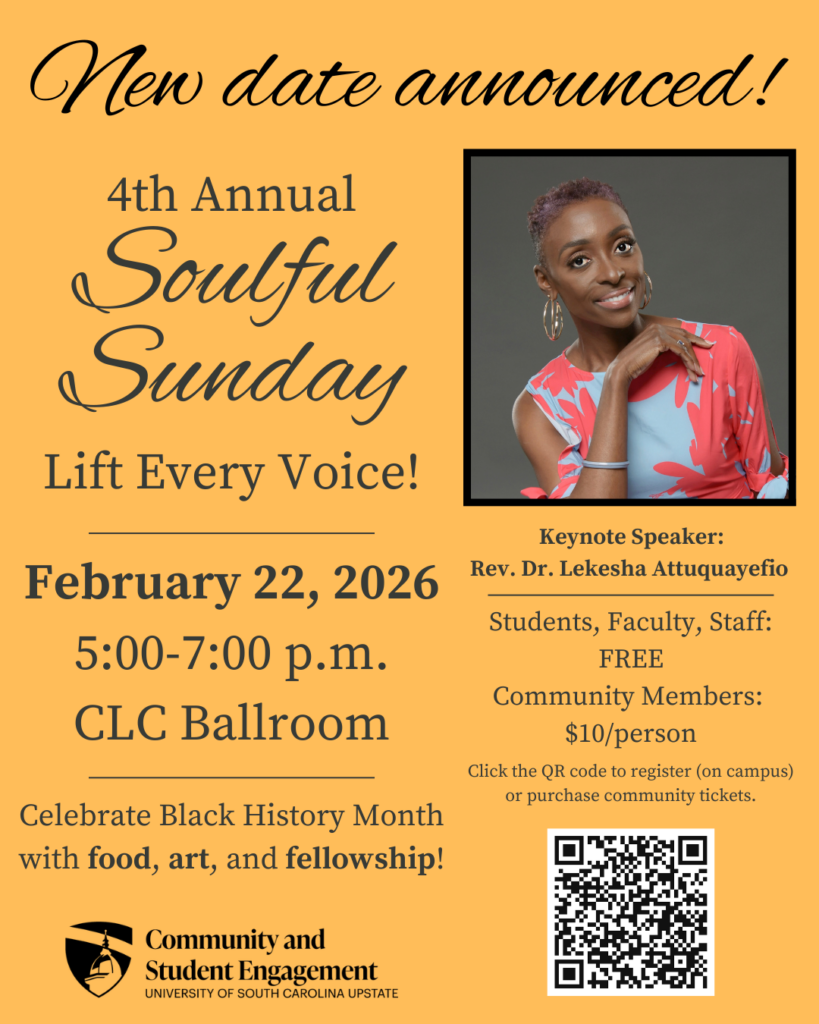 You are invited to attend our fourth annual Soulful Sunday, the campus’ kick-off event for Black History Month, on February 22 from 5:00-7:00 p.m. Our theme for Black History Month this year is “Lift Every Voice” and we will highlight how we can lift our voices through art, advocacy, civic engagement, and more throughout February.