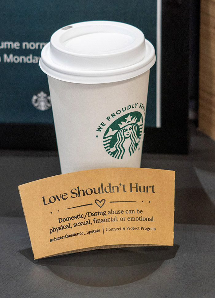 This month, students ordering seasonal drinks such as pumpkin-spice lattes or hot cocoa at Perk Up will receive their beverages in sleeves carrying the message: “Love Shouldn’t Hurt: Domestic/Dating abuse can be physical, sexual, financial, or emotional.”